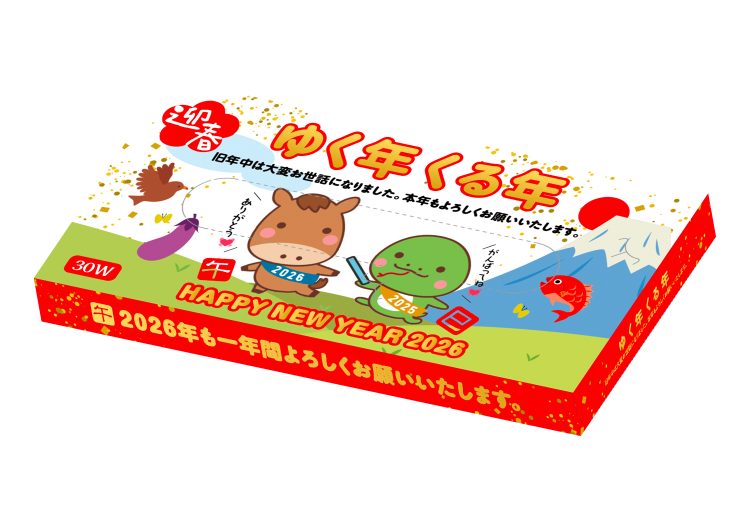 かわいい巳と午のバトンリレーがデザインされたパッケージです。裏面には2026年のカレンダーが印刷されており便利です。